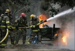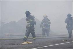 After extinguishing an outside paper storage fire, Monroe Firefighters, still in full protective gear and self-contained breathing apparatus (SCBA), regroup for another assignment. |