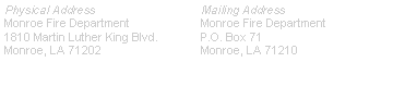 Monroe Fire Department 1810 Martin Luther King Blvd Monroe, LA (318)329-2474 Jimmie R. Bryant, Fire Chief |